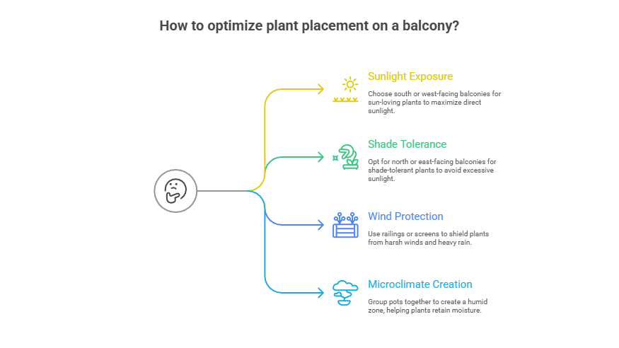 Protection: Balconies can amplify wind and rain. Use railings, screens, or taller pots to shield delicate plants from harsh gusts or heavy showers that can damage foliage.