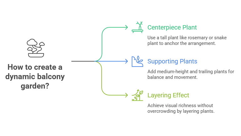 A great balcony garden feels dynamic, not flat — and the key to that is height variation. Using different plant sizes creates a layered effect that draws the eye and makes your setup look fuller than it really is.
