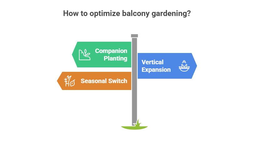 Vertical expansion: If your balcony space is tight, use hanging pots, wall planters, or small trellises to maximize growing area without cluttering the floor.