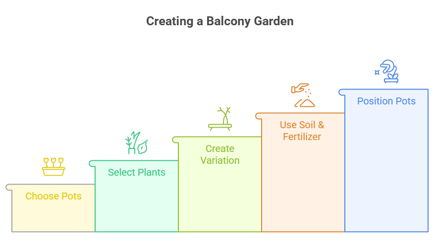 Step-by-step to balcony garden success — from choosing pots to perfect placement, these five stages turn any balcony into a thriving green retreat.