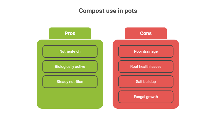 Key pros and cons of using compost in pots — nutrient-rich but can cause drainage and salt issues if overused.