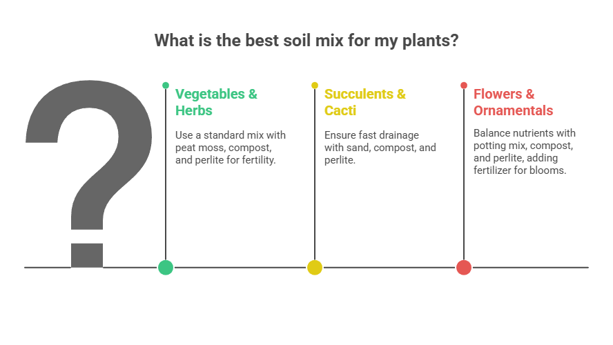 Container mixes aren’t one-size-fits-all — different plants thrive in slightly adjusted recipes. What is the best soil mix for vegetables, herbs, or flowers? Use these quick-reference formulas to fine-tune your results: